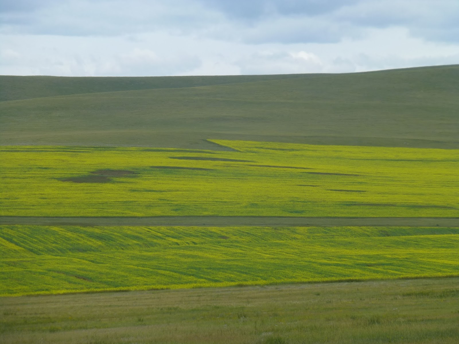 Crossed railway (Beijing to Moscow train?) at Bayangol, nestled at base of mountains. Tidy town, work gangs cleaning debris from sides of road, burning off tyres (also used to heat bitumen before laying). Nice to see town pride after rubbish of earlier communities. Rolling hills, hectares of sown grains/ wheat, interrupted only by natural features eg gullies, greener than grasslands, with no flowers, no fences. Through Khongol with its decaying Russian infrastructure (“Mongolian Chemical 1992”). Sign to show reached outskirts - the name of the town crossed out with a red line. Fields of gold - canola?