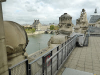 Raining constantly, we loaded up with all our wet-weather gear. Caught train in, then red bus at Champs Élysées. Did almost whole loop again to get to our stop at Musee d'Orsay, but good to hear audio again to match names with buildings and re-hear notes.