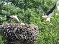 Off next to the stork colony in the Nature Reserve which provided an excellent experience, many storks and chicks in high nests scattered through the forested area. We took the binoculars and camera up to the top of the viewing platform and were rewarded with excellent views of storks cleaning nests, flying out on food hunts, and feeding (or ignoring!) demanding chicks. The poor parents of a family of four were kept busy and looked downright frazzled. Also saw a couple of yellowhammers loudly singing, with their distinctive orange spot across their backs.